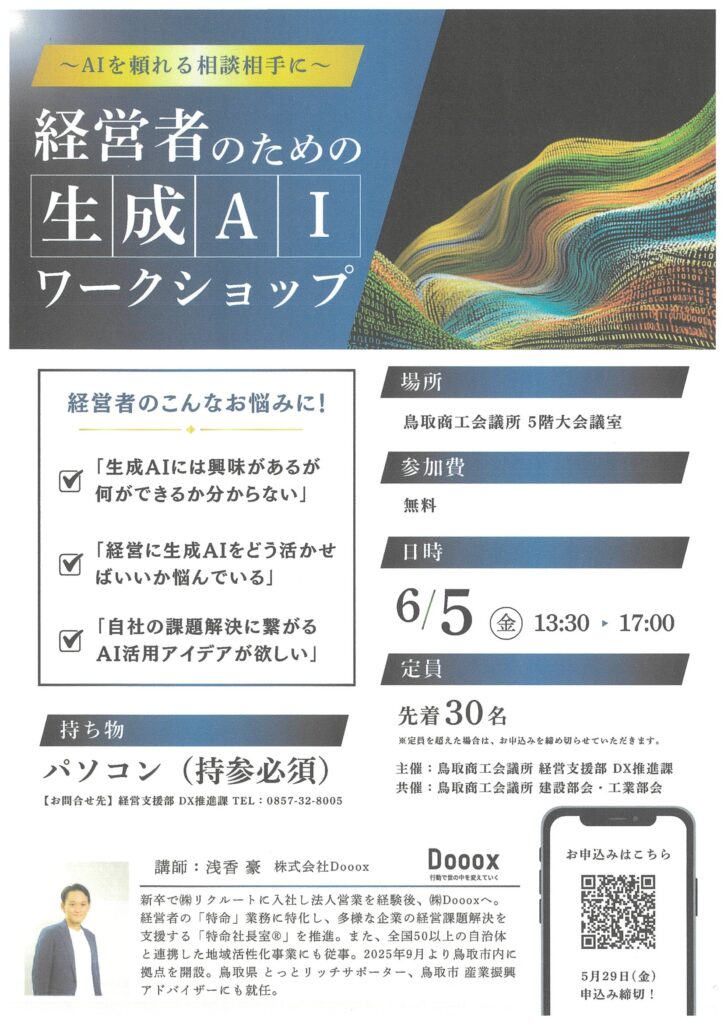 鳥取商工会議所では、急速に普及が進む生成AIを「頼れる相談相手」として、経営者が自社の課題解決に直結する具体的な活用アイデアを得るためのセミナーを開催します。