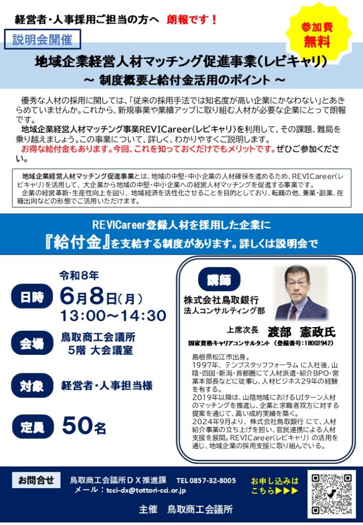 地域の中堅・中小企業における人材確保は喫緊の課題であることから、鳥取商工会議所では、REVICareer(レビキャリ)を活用した、大企業から地域の中堅・中小企業への経営人材マッチングを促進し、経営革新や生産性向上を図り、地域経済を活性化させることを目的に地域企業経営人材マッチング促進事業説明会を開催いたします。「従来の採用手法では知名度の高い企業にかなわない」という方等のご参加をお待ちしています。